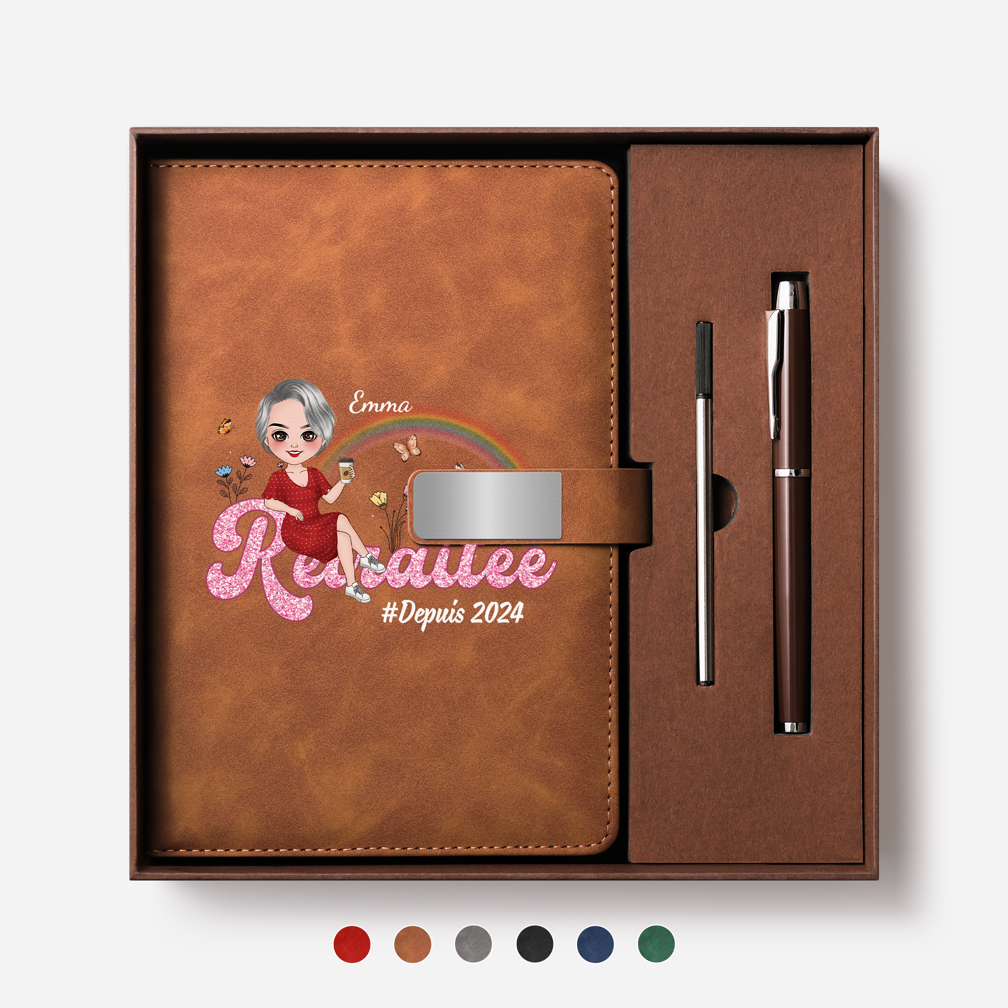 - Un coffret carnet personnalisé moderne: Ce set associe un carnet premium et un stylo assorti, alliant utilité et valeur émotionnelle. L’impression UV met en valeur les visuels avec des couleurs intenses et un rendu net, parfait pour un usage quotidien ou comme cadeau.