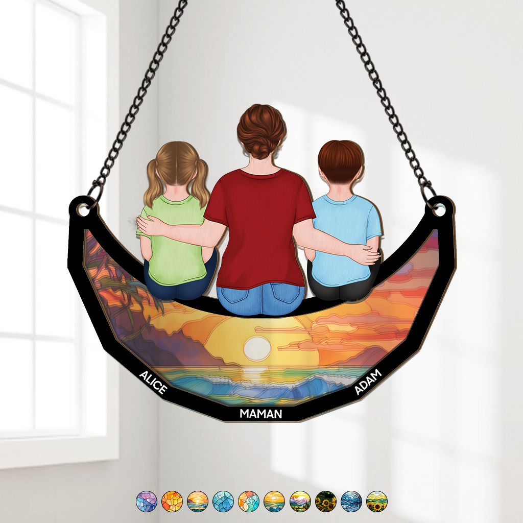 Maman Et Ses Enfants Tournant Les Dos - Cadeau Personnalisé | Attrape-soleil Vitrail Personnalisé