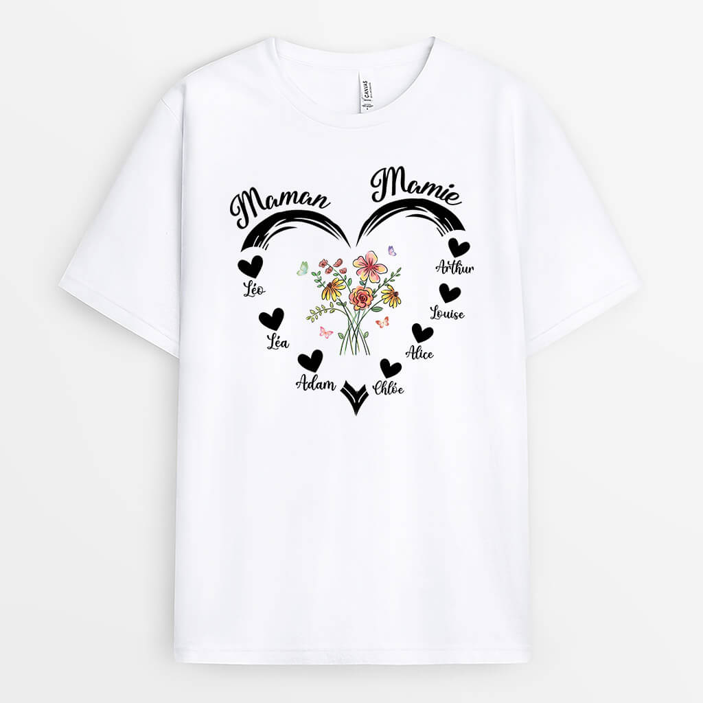 Maman/Mamie Coeur Avec Fleurs - Cadeau Personnalisé | T-shirt pour Femme