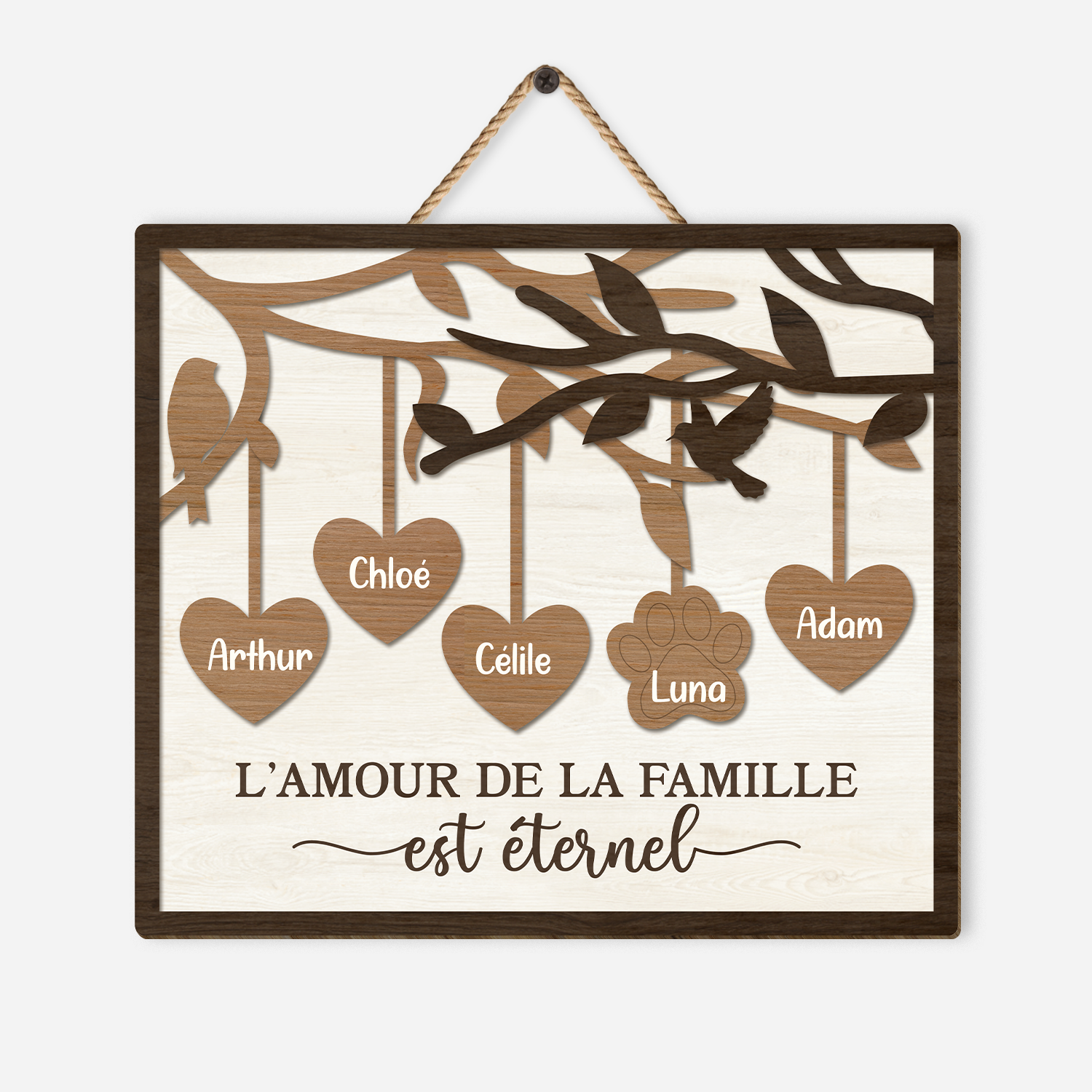 - Contenu : 1 plaque en bois + 1 corde en jute pour la suspension.